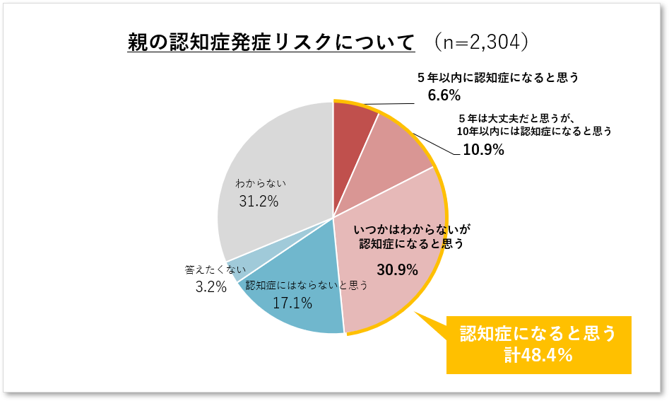 - 親の認知症発症リスクについて、約半数が「いつか認知症になると思う」。
