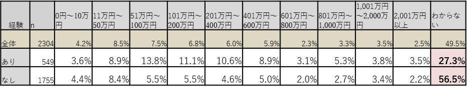経験有無別の「わからない」の回答率は、「なし」の人の56.5%に対し、「あり」の人は27.3%にとどまり、必要金額の理解度に差があることがわかる。