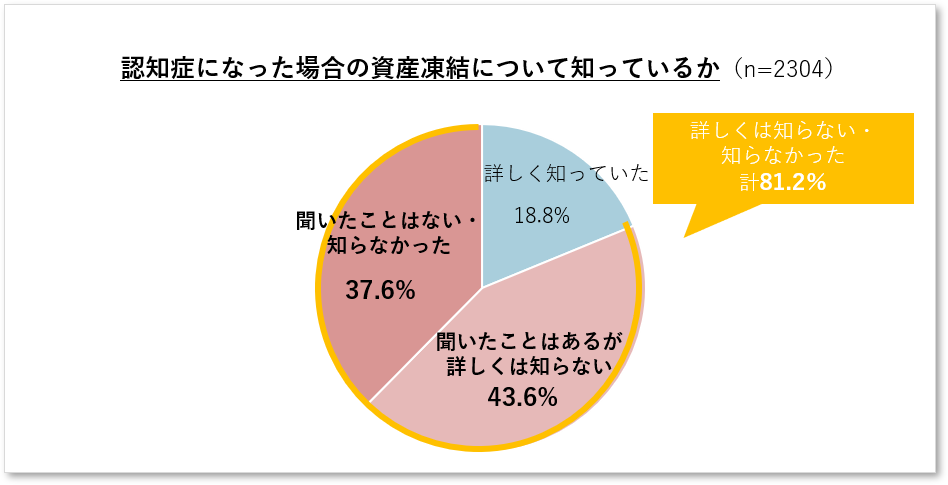 - 介護費用の財源は「親の資産で賄う」が約4割で最多。一方、認知症になった場合の 資産凍結については「詳しくは知らない」「知らない」が8割以上。