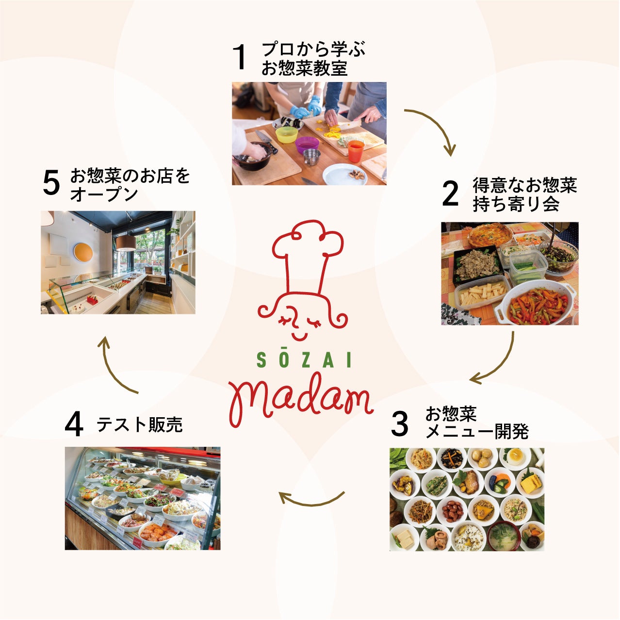 「惣菜マダム」は、お料理が大好きで、その特技を「みんなのために役立てたい!」という人が集まって、プロの先生から料理を学び、お惣菜のマーケティングや商品開発をして、お惣菜を販売する市民プロジェクトです。最終的にはまちなかでお惣菜店の開業を目指します!