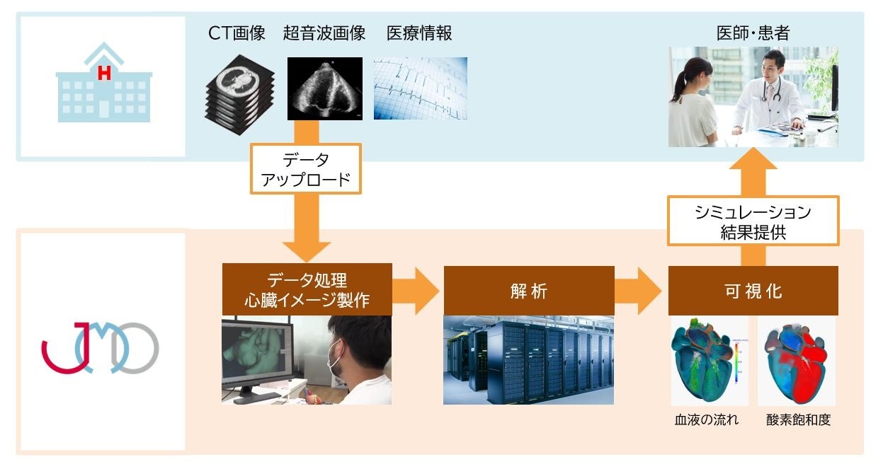 JMDでは、医療機関からアップロードされたデータを基に、必要な画像処理を⾏い、⼼臓シミュレータで解析を⾏い、解析結果を基に医療観点からレポートを作成、その結果を医師に提供します。
