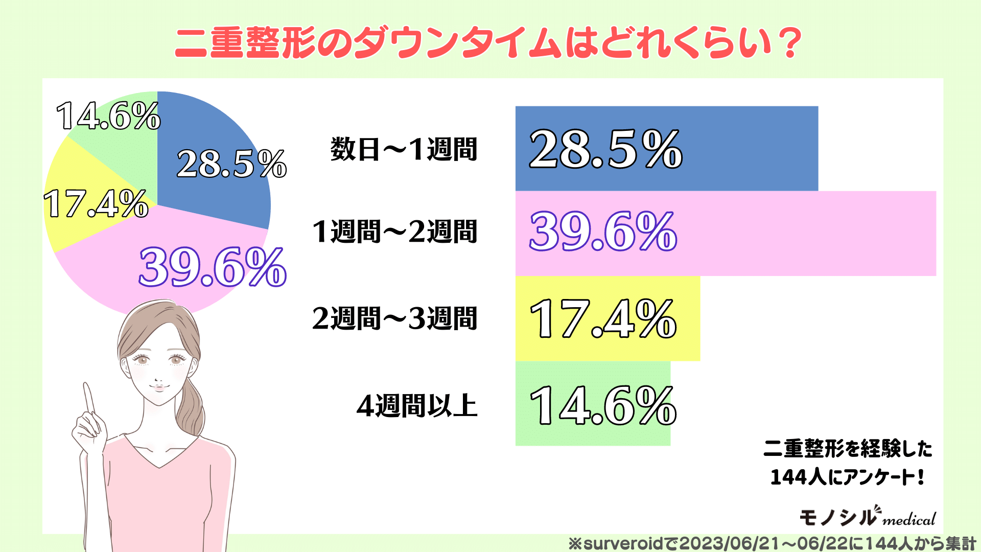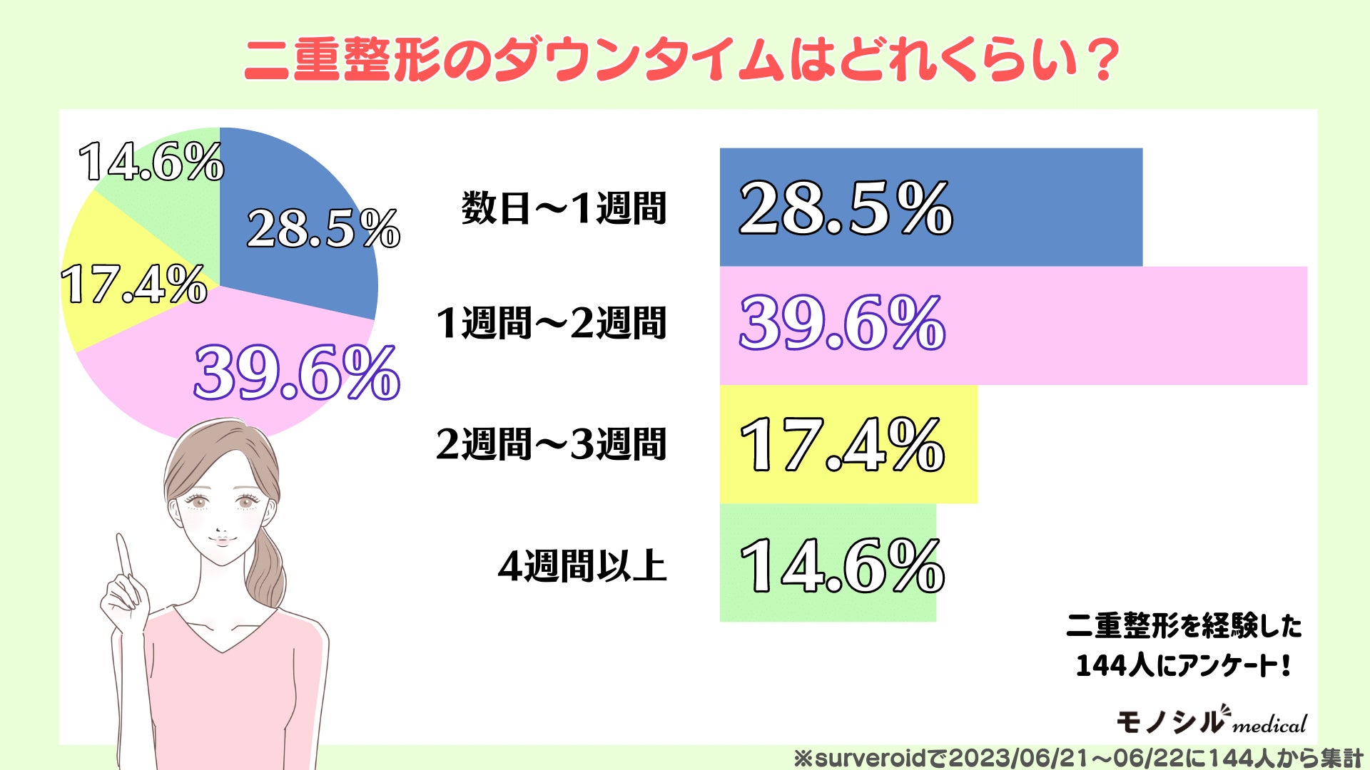 二重整形のダウンタイム期間に関するアンケートの結果は、「数日〜1週間」が28.5%、「1週間〜2週間」が39.6%、「2週間〜3週間」が17.4%、「4週間以上」が14.6%となりました。