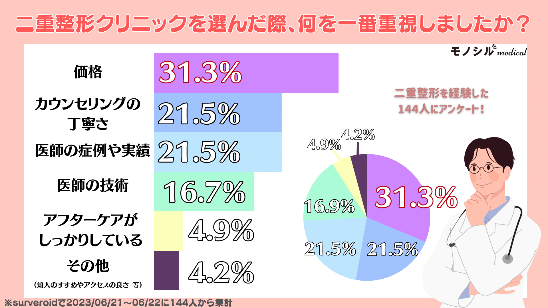 二重整形のクリニックを選んだ際、何を一番に重要視したかというアンケート調査に対して、「価格」が31.3%、「カウンセリングの丁寧さ」と「医師の症例や実績」が21.5%、「医師の技術」が16.7%、「アフターケアがしっかりしている」が4.9%、その他が4.2%という結果になりました。