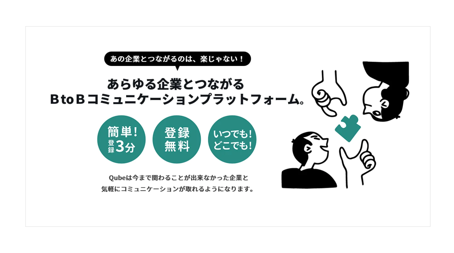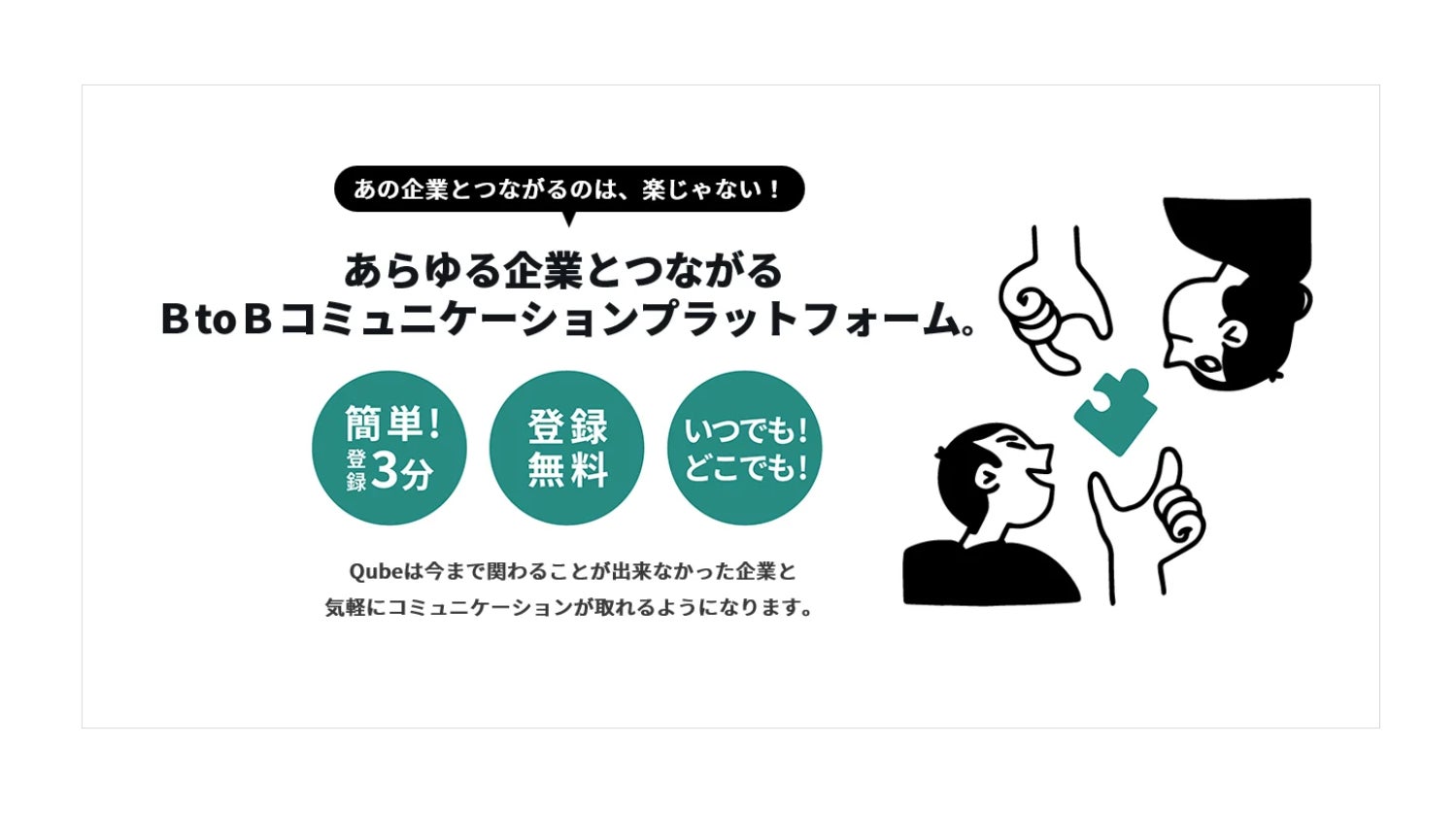 「Qube」は、「SNS・チャット」「イベント」「会議室シェア」の3つの機能を軸に、オンラインとオフラインを融合させることで、企業間の新たなつながりとビジネスチャンスを創出するBtoBコミュニケーションプラットフォームです。