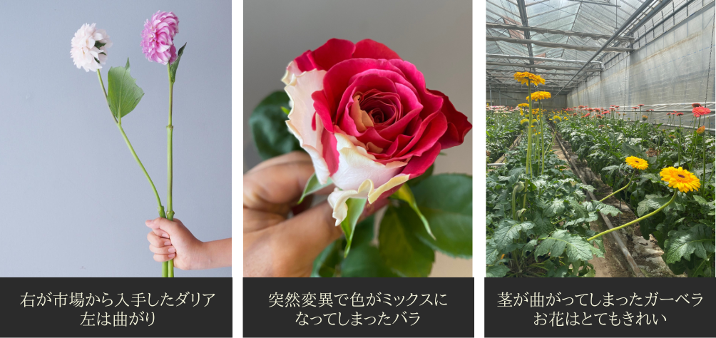 花市場の基準から外れ、通常捨てられてしまう規格外の花を指します。これらは茎の太さや長さ、花の輪の大きさなどがまばらなだけできれいなものばかりです。Hanavieはこれら規格外の花を「プラスフラワー」と名付けました。花は特別な日に贈るイメージですが、日常にプラスするきっかけになってほしいという願いを込めています。