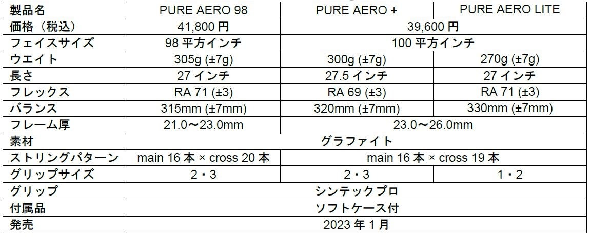 バボラVSジャパン株式会社(本社:東京都狛江市、カントリーマネージャー:梅原 充史)は、2022年8月に発売したテニスラケットの【PURE AERO】シリーズから「PURE AERO(ピュアアエロ)98」「PURE AERO +」「PURE AERO LITE」、そして新たに【PURE DRIVE】シリーズから「PURE DRIVE(ピュアドライブ)98」を発表。