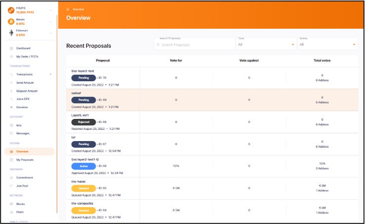 このDAOの投票機能の実装により、ユーザーがフルーツブロックチェーンシステム内での提案の可否の投票や能動的に提案を行うことができるので、フルーツブロックチェーンコミュニティ内での動きの活性化に繋がると考えております。