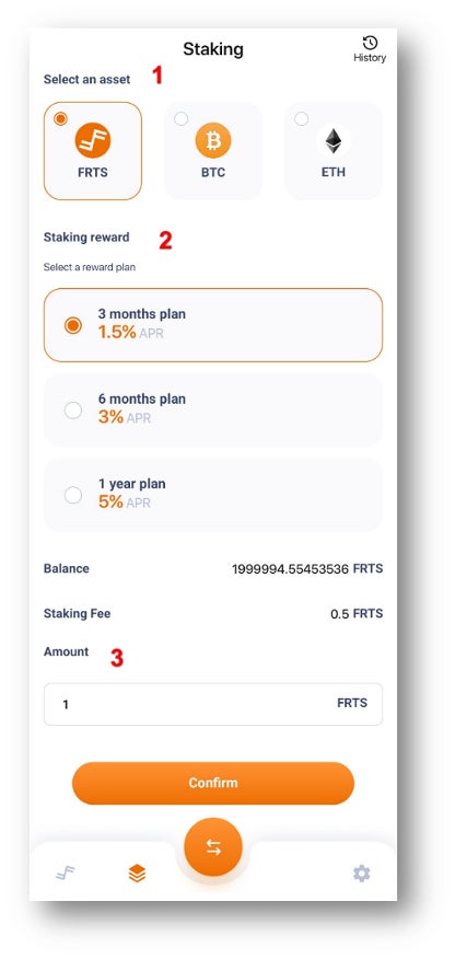 ステーキングとは、暗号資産を保有しブロックチェーンのネットワークに参加することで、対価として報酬が貰える仕組みです。今回は、任意の量の ETH、BTC、FRTS を持つユーザーが、ネットワークに参加し、ネットワークのブロック承認に貢献することにより、その過程で報酬を得ることができます。