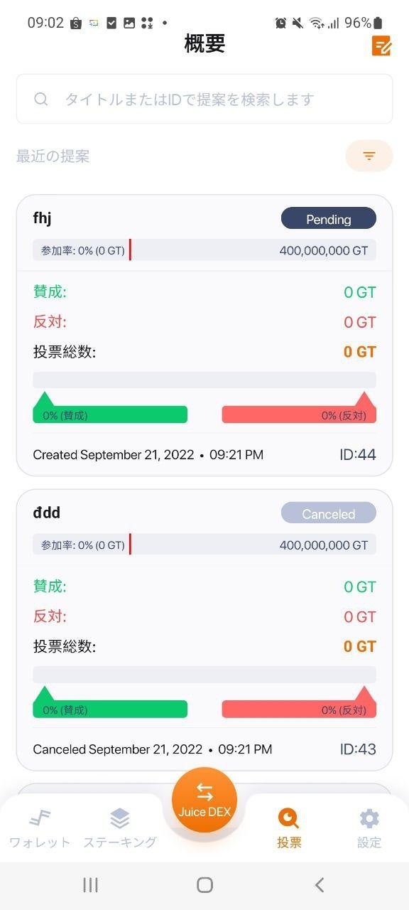 ユーザーがフルーツブロックチェーンシステム内で上がってきた提案に対して、一定量のGTを保有することで、提案に対する拒否を行うことができます。この拒否をできるGTの最低保有量は、提案の重要性によって異なります。