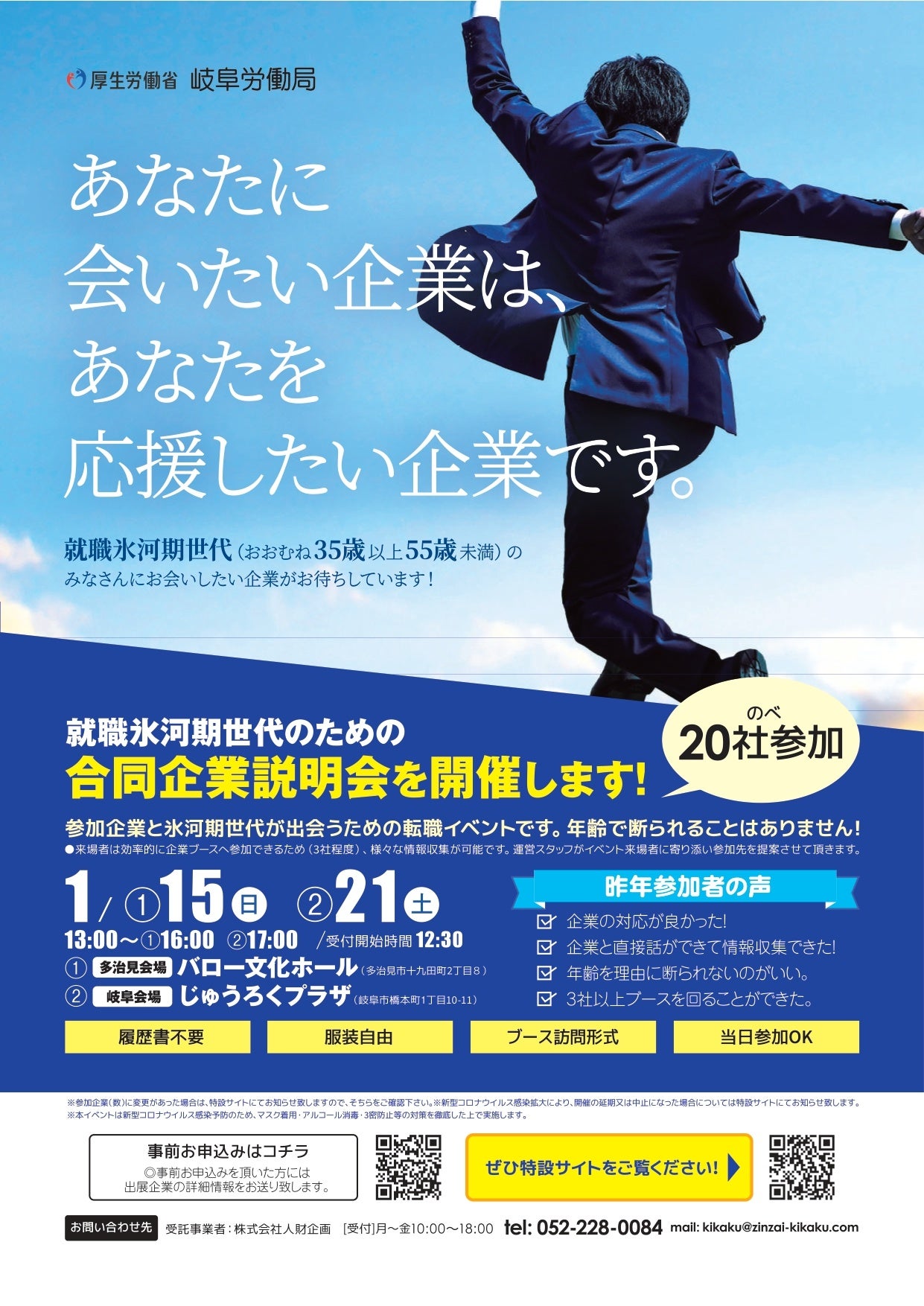【岐阜労働局】就職氷河期世代を対象とした合同企業説明会を1月15日・21日に開催します!