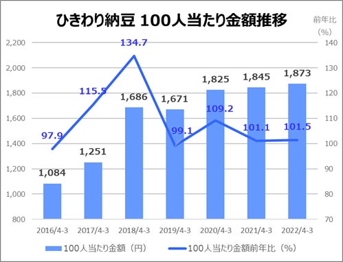 全国15歳~79歳の男女53,600人の消費者から継続的に収集している日々の買い物データを示すインテージ SCI(15-79歳)(全国消費者パネル調査)による「ひきわり納豆 100人当たり金額推移」では、2018年度にマスコミで取り上げられ飛躍的に伸長した後も戻ることなく市場拡大を続けていることが示されており、ここからも「ひきわり納豆」の人気が年々上昇傾向であることがうかがえます。