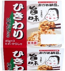 「おかめ納豆」では、均一なサイズに揃え、断面が平滑な食感の良いひきわり原料を使用しています。