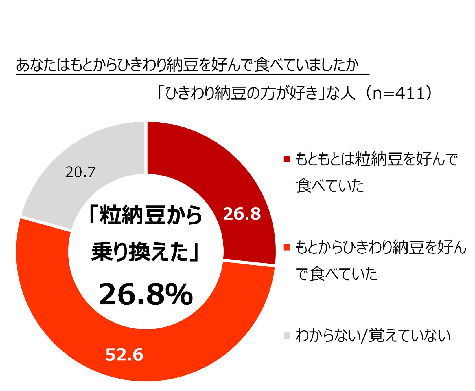 タカノフーズ株式会社が2022年8月に実施した調査では、日本人の7割以上が納豆好きであり、そのうちひきわり納豆派は2割に及んでいるという結果が出ています。一見少数派に見えますが、そんなひきわり納豆派の人の中では、粒納豆から乗り換えたという人が26.8%となっており、ひきわり先輩の魅力に気づいて粒納豆先輩からの“推し変”をし始めた”ひきわり納豆ラバー“が全国で増加中のようです!