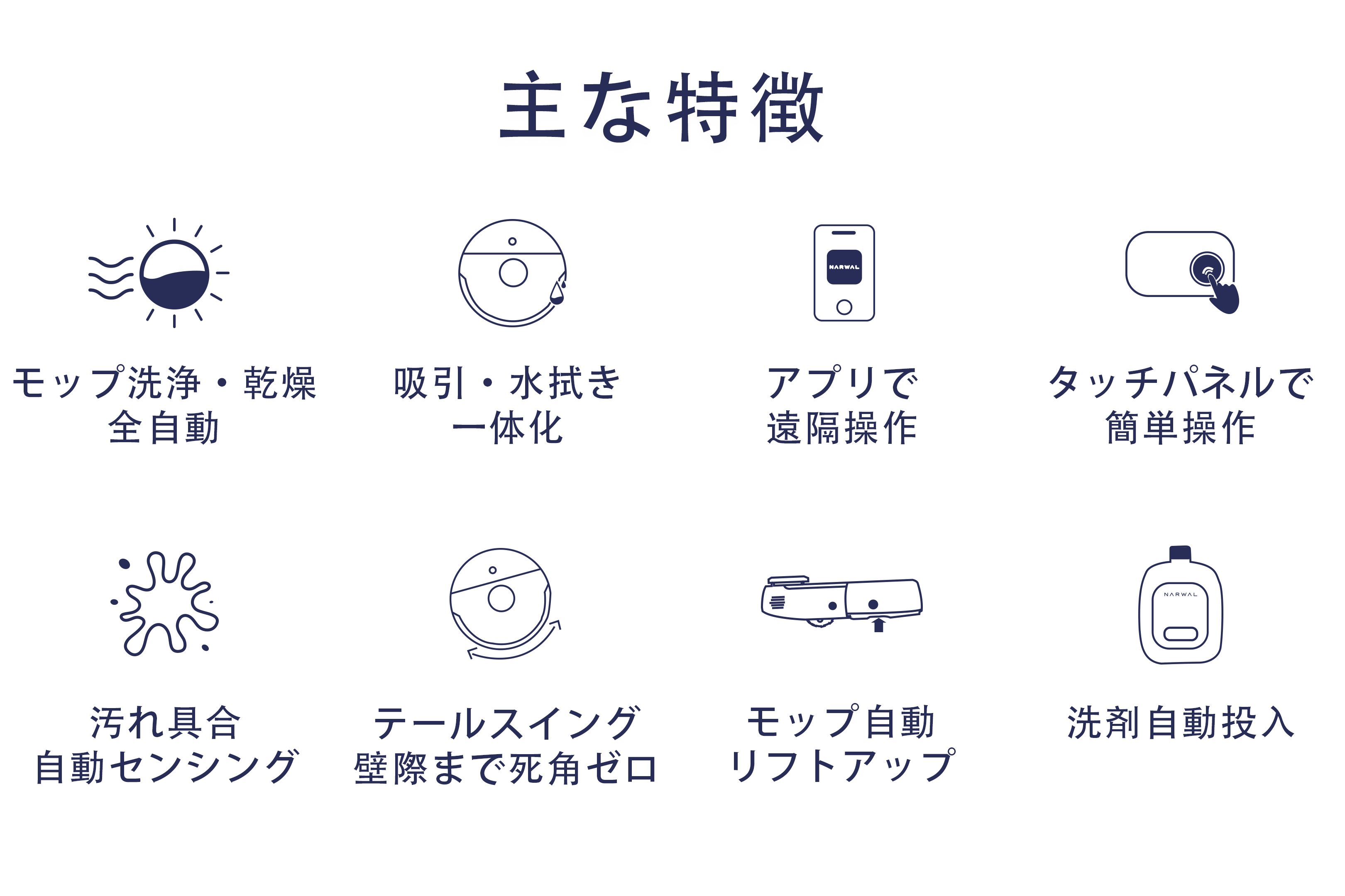 Narwalはそのようなライフスタイルの変革を自社ビジョンとして日々奮闘しています。世界中に便利な「スマート家電」が広がり、忙しい皆さまの代わりに家事を全うし、好きなことに時間を割くことができ、大切な人々との楽しい時間をたっぷり楽しむことができる世界を実現していきたいと思っています。主な特徴やアフターサービスは以下でご紹介します。