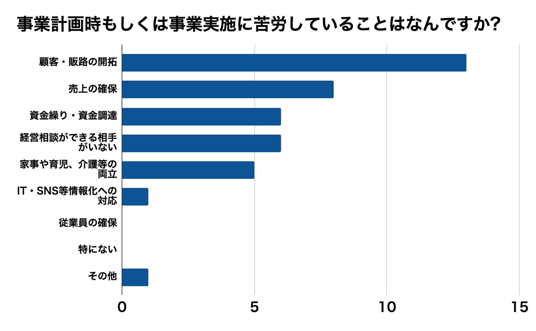 また、アカデミーを受講した地域の新規創業・第二創業を目指す事業者にとって、苦労していることとして「顧客・販路の獲得」や「売上の確保」等が上位に挙がりました。