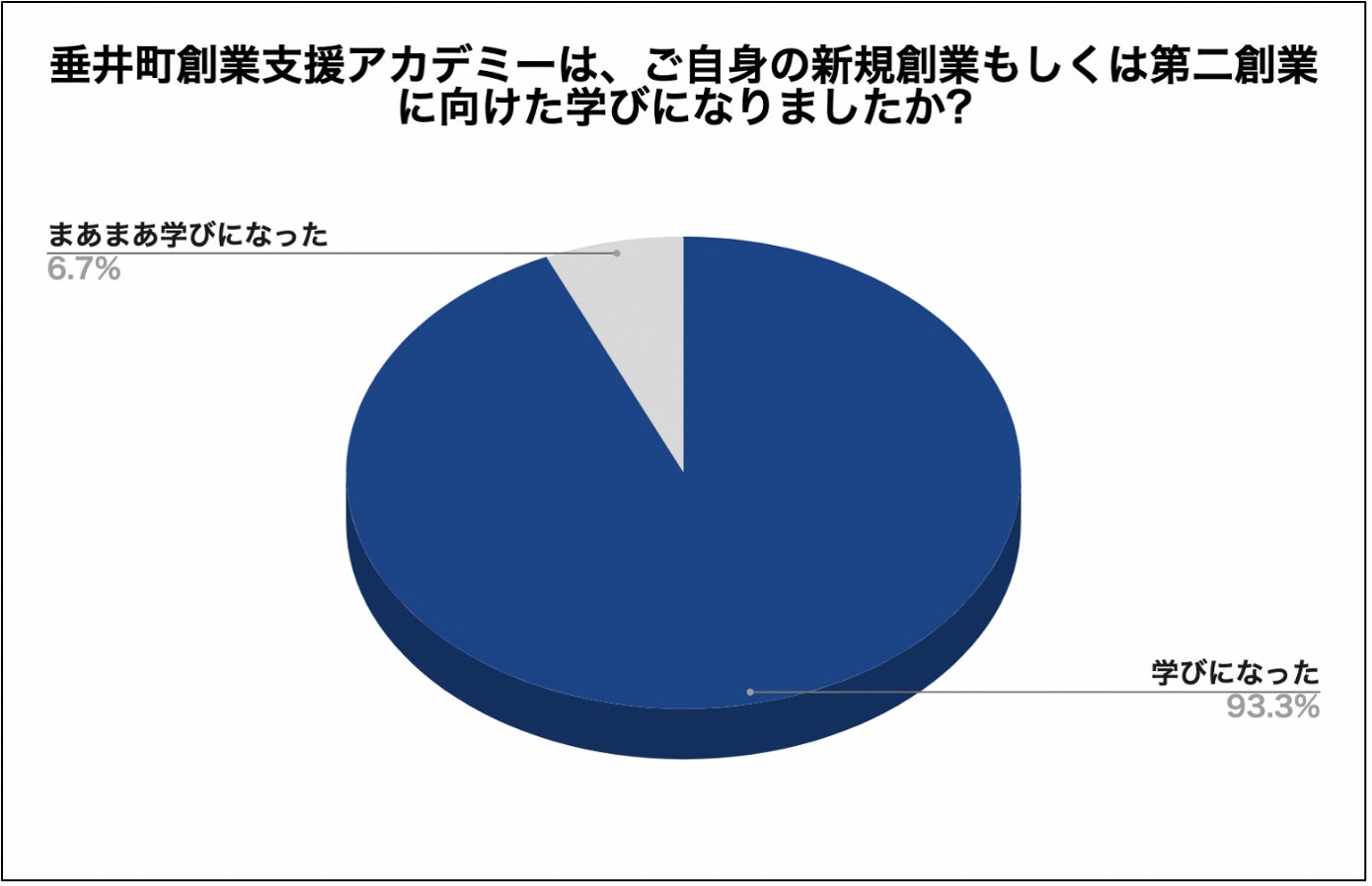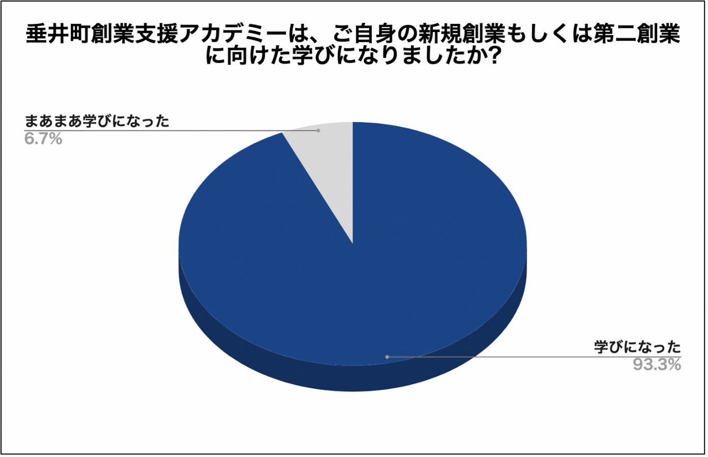 結果、本アカデミーが自身の新規創業・第二創業に向けて「学びとなった」と93%が回答し、また26%の方がアカデミーを受講したことにより、創業に向けた準備状況が進展したと回答を得ることができました。