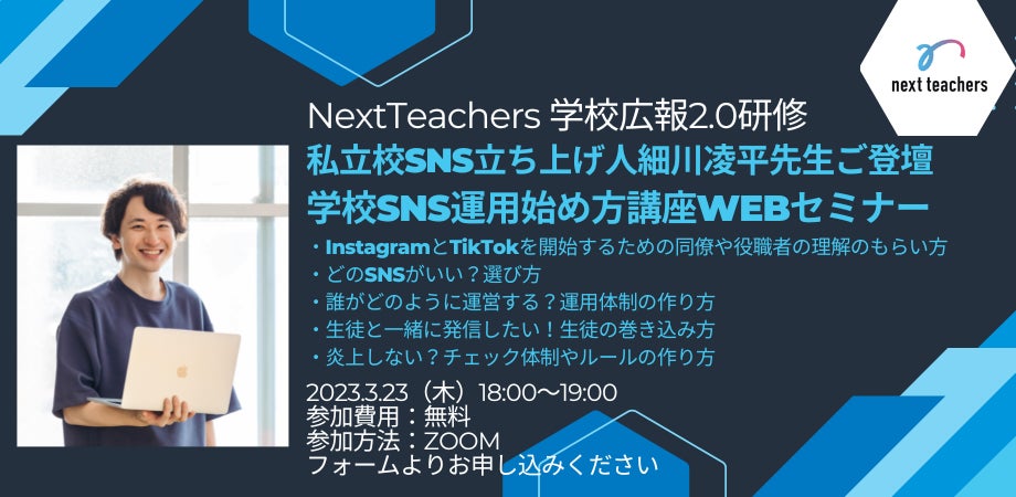 教員の授業研修やICT活用研修、学校広報を支援している株式会社NextTeachers(所在:東京都北区、代表取締役社長:渡辺 健太、以下NextTeachers)では、学校広報でのSNSの立ち上げ方に関する無料WEBセミナーを、を2023年3月23日(木)18時に開催します。登壇者には、私学の広報施策としてTikTokやInstagramをいち早く取り入れ、生徒募集に成功された細川凌平先生を予定しております。