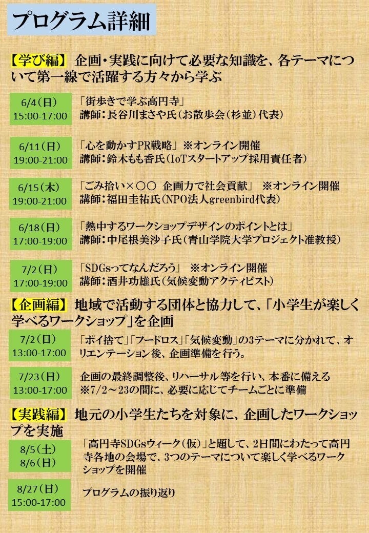 「高円寺SDGsウィーク(仮)」と題して、2日間にわたって高円寺各地の会場で、3つのテーマについて楽しく学べるワークショップを開催
