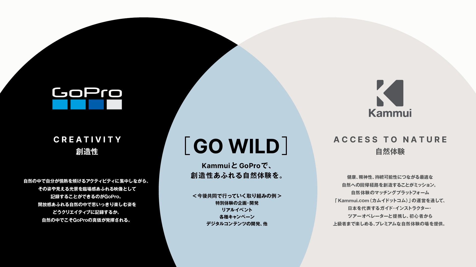 KammuiとGoProは、人々がより自然にアクセスし、エキサイティングな自然体験の素晴らしさを世界中でシェアしていく、という目的を共有しています。このたび、「Kammui」ブランドの認知拡大、および自然体験におけるGoPro製品の利用促進のため、両社はそれぞれの領域の強みを活かし長期的なパートナーシップを築いていくことで合意いたしました。