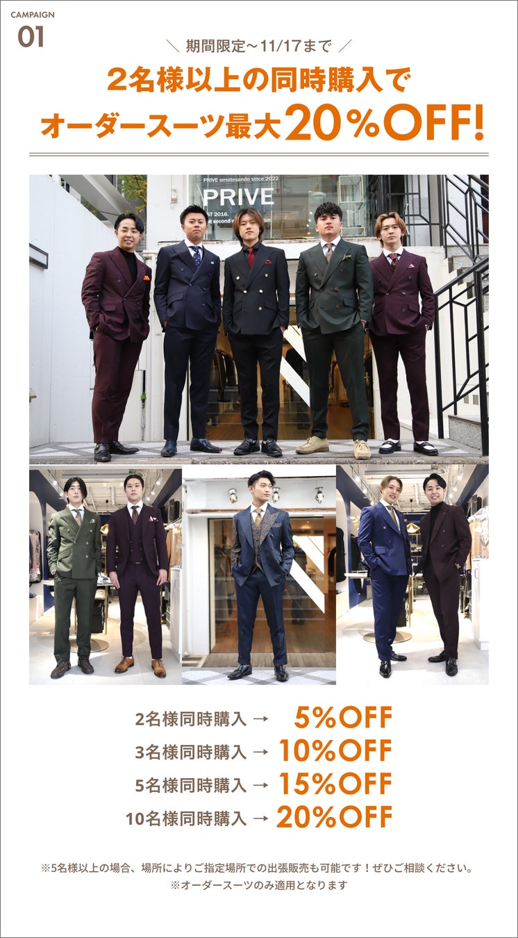 2名様以上の同時購入でオーダースーツが最大20%OFF!