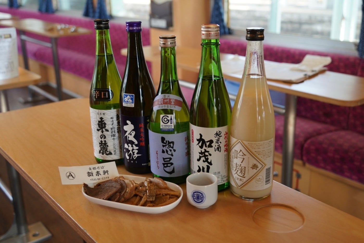 南陽市のラーメンの出前や、隠れ蕎麦屋の里しらたかのそばのお振る舞いなど、沿線ならではの味が楽しめます。さらに、長井市名物の馬肉ラーメンにちなんだ「長井市のラーメン屋吞兵衛セット」や、地元菓子店が特別に作ったそば粉スイーツなど、ここでしか味わえないメニューもご用意。