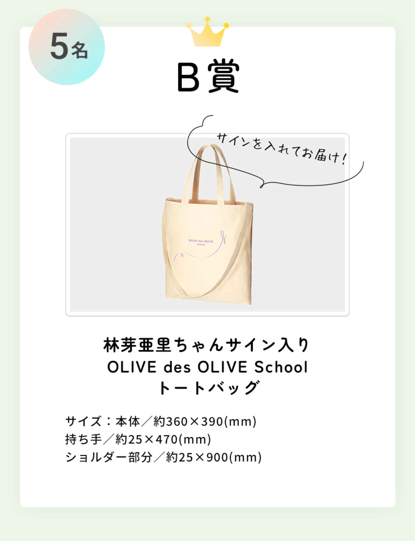 【B賞 5名】林芽亜里ちゃんサイン入りOLIVE des OLIVE Schoolトートバッグ1点