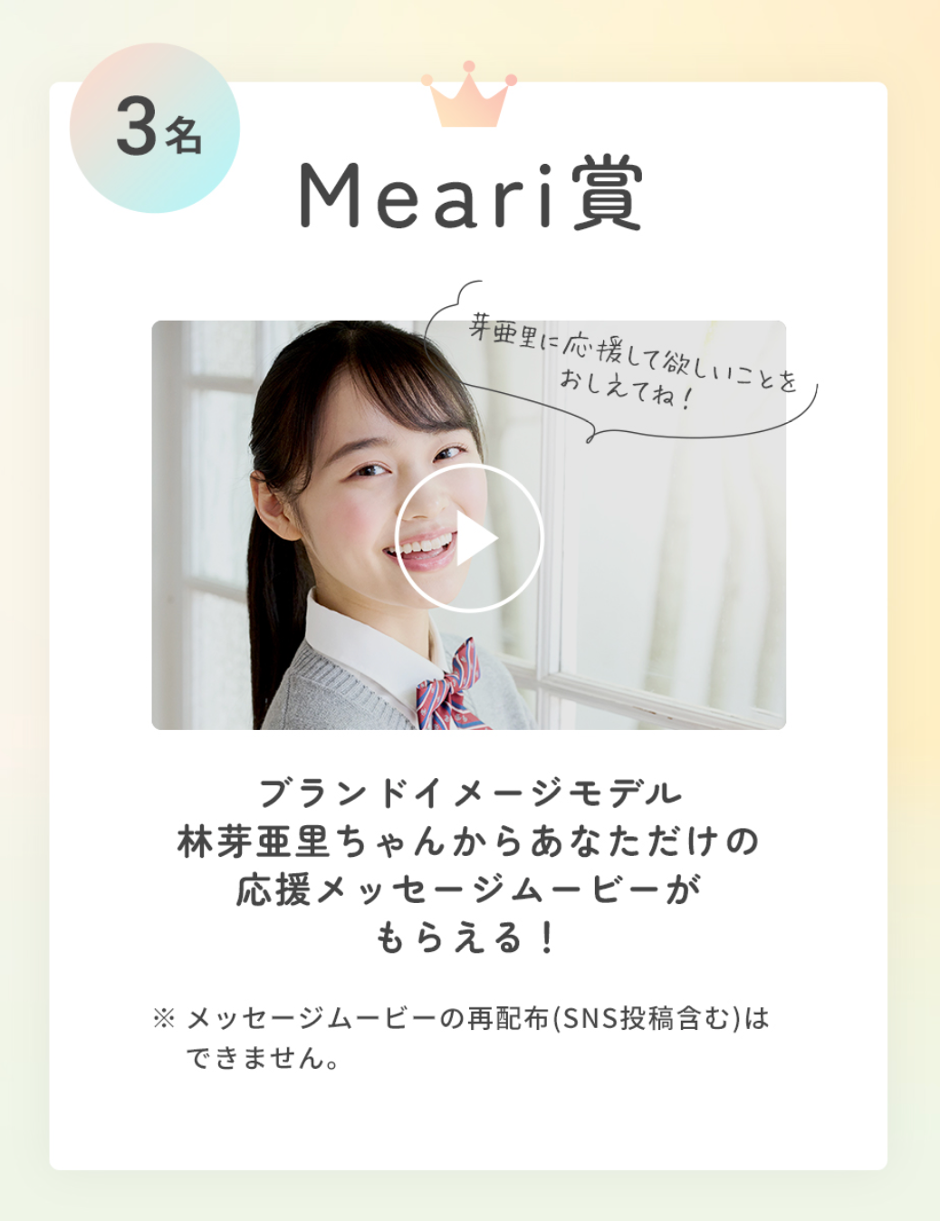【Meari賞 3名】ブランドイメージモデル「林芽亜里」ちゃんから、あなただけの応援メッセージムービー