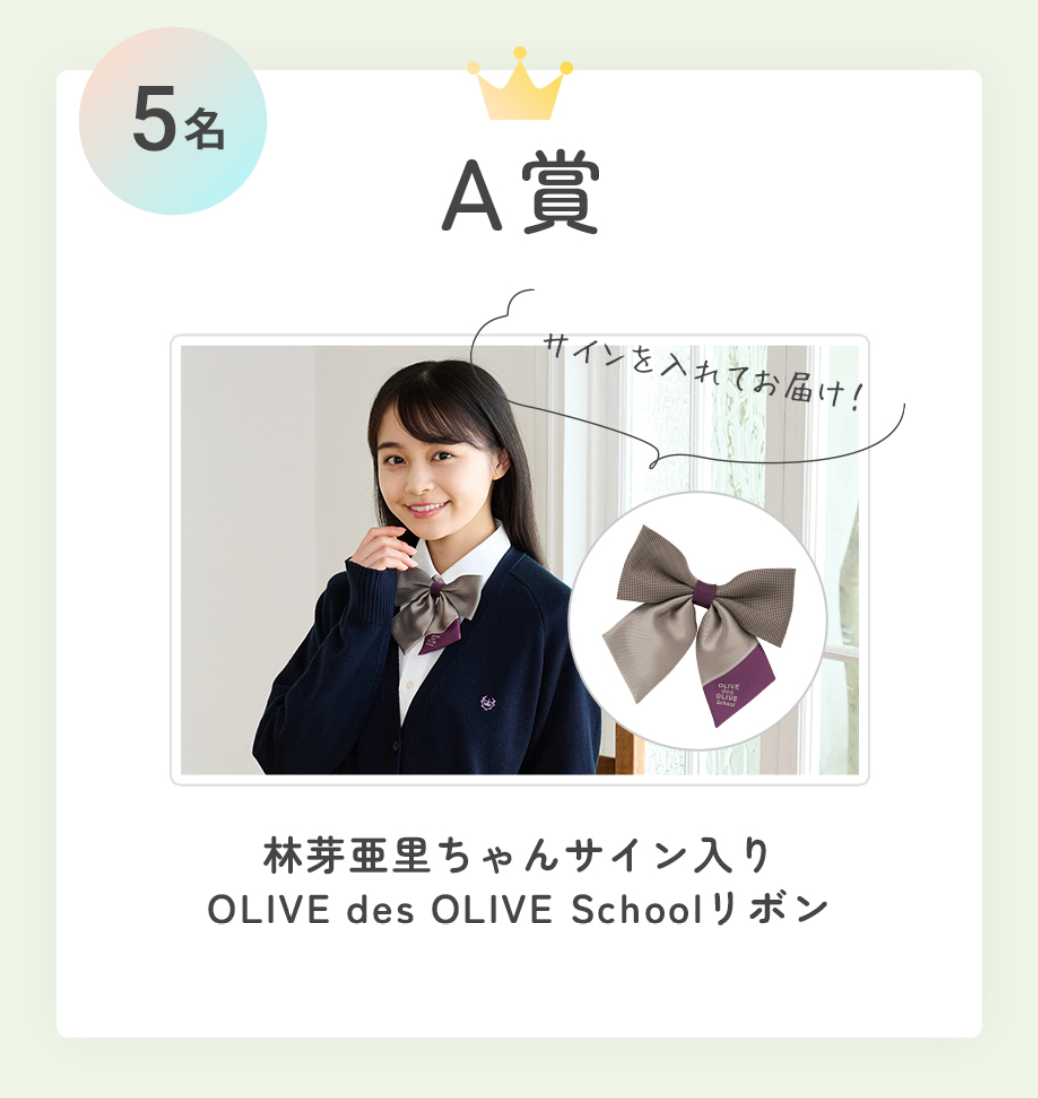 今回のキャンペーンではOLIVE des OLIVE Schoolの商品を税込1,000円以上購入された方対象に、購入されたレシートで、「Meari賞:林芽亜里ちゃんからあなただけの応援メッセージムービー(3名)」「特賞:トンボ学生服製造スクールブランド&be(アンビー)制服4点セット(7名)」「A賞:林芽亜里ちゃんサイン入りリボン(5名)」「B賞:林芽亜里ちゃんサイン入りトートバッグ(5名)」「C賞:リボン(30名)」「D賞:ステンレスミラー(50名)」「Wチャンス賞:&beソックス(200名)」の合計300名に抽選でプレゼントが当たります。