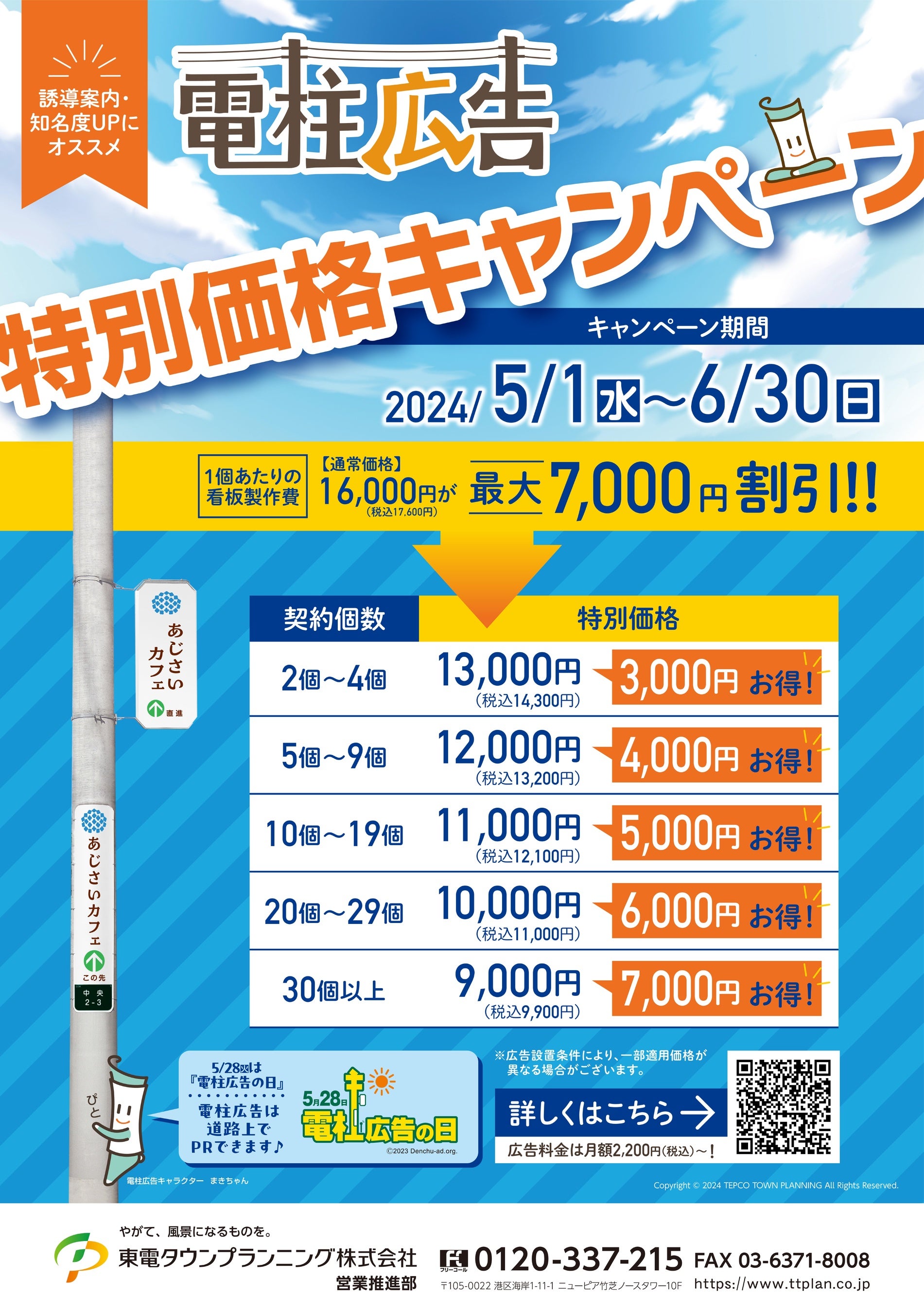 2024年5⽉1⽇より電柱広告の製作費が⼤幅に割引となる「特別価格キャンペーン」を実施いたします。期間中に電柱広告をお申込みいただいた場合、製作費が最⼤7,000円の割引となります。
