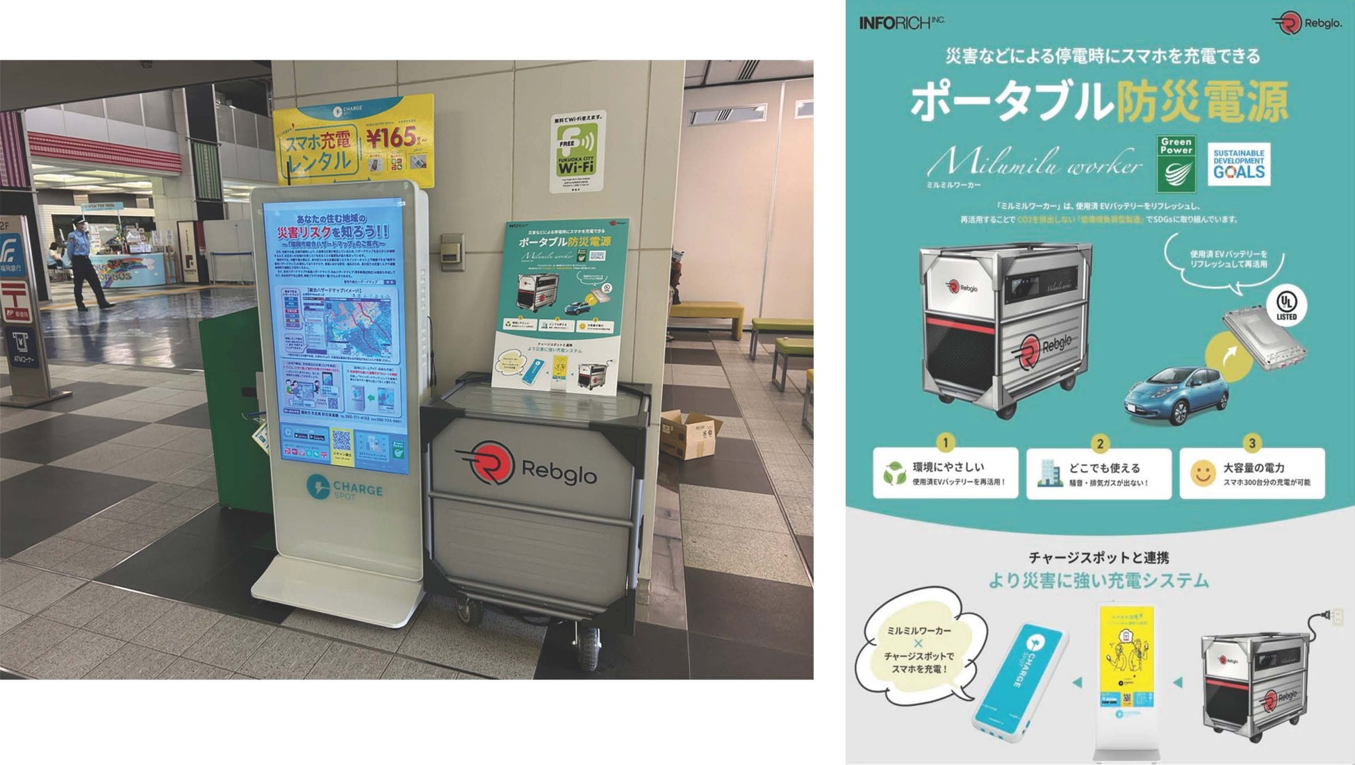 株式会社REBGLO.(リブグロ)(本社:東京都千代田区、代表取締役:村越 誠)は、SDGsへの取り組みの一環として、福岡市役所本庁舎に「ミルミルワーカー(Milumilu Worker)」✕「チャージスポット(ChargeSPOT)」の連携により、災害などの停電時にスマホを充電できるポータブル防災電源を付帯設備として導入していただきました。