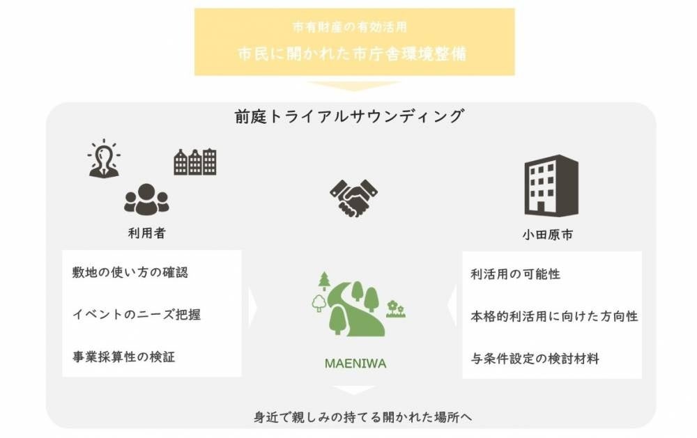 小田原市では、公民連携による効率的な施設整備や公共施設の運営、市有財産の有効活用を推進しています。その一環として、市役所本庁舎前庭の効果的な活用方法を探るため、トライアルサウンディングを実施しています。