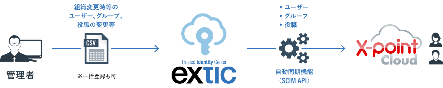 これにより、X-point Cloud上のユーザー、組織、役職情報を統合ID管理サービスのExtic上で一元管理することが可能となります。