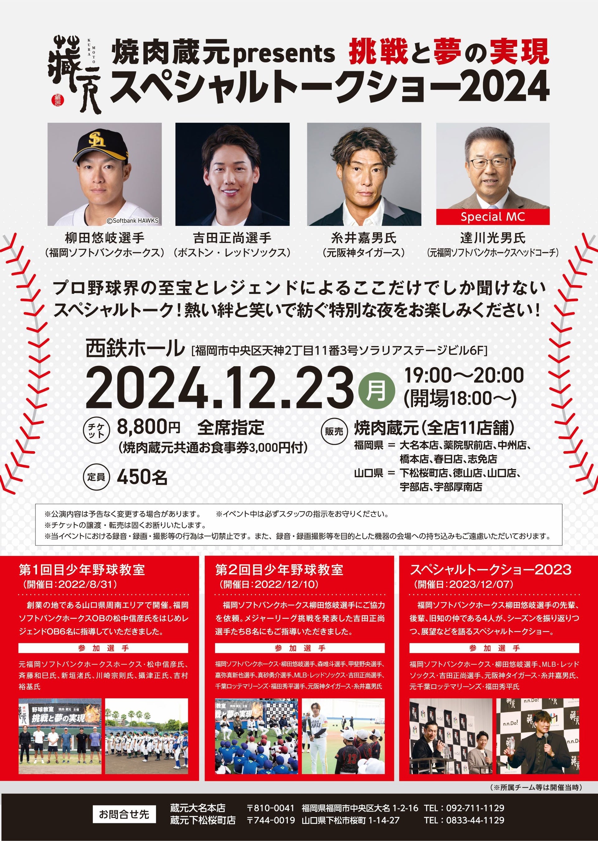 プロ野球界の至宝とレジェンドによるスペシャルトークショー!食事券付きチケットは、12月3日(火)から福岡・山口の「焼肉 蔵元」全店で発売開始いたします!