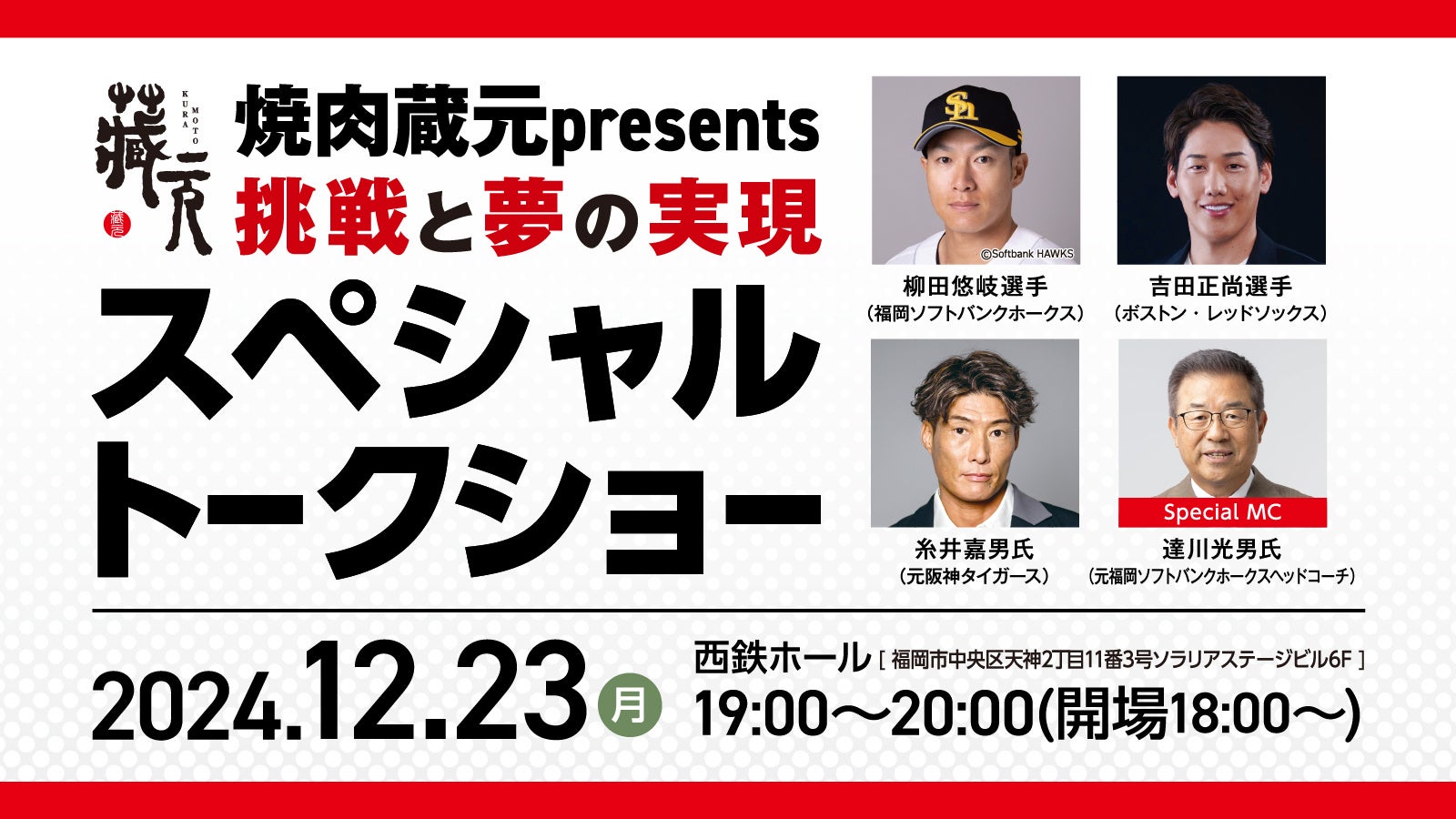 【焼肉 蔵元】12月23日開催、ソフトバンクホークス・柳田悠岐選手やレッドソックス・吉田正尚選手、糸井嘉男氏によるトークショー、スペシャルMCは達川光男氏!(福岡市)