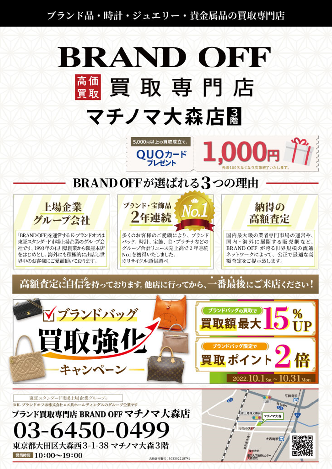 ブランドリユースNo.1(※)のコメ兵ホールディングスグループの一翼である株式会社K-ブランドオフ(石川県金沢市)は、東京都大田区のマチノマ大森に「BRAND OFF 買取専門 マチノマ大森店」をオープンいたしました。