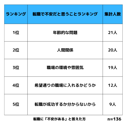 1位となったのは、「年齢的な問題で転職が上手くいくかどうか不安」という回答でした。