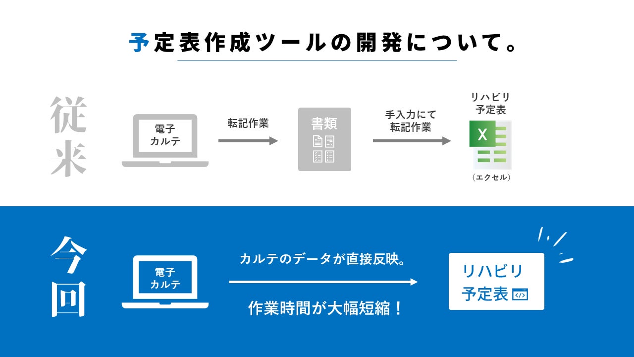 病院で勤務するセラピストは、患者さまへのリハビリテーション(以下:リハビリ)治療に加え、多岐にわたる書類作成業務を行っています。その中でも重要な業務の一つに、患者さまの一日のリハビリスケジュールをまとめた「リハビリテーション予定表」の作成業務があります。この予定表では、リハビリ時間をはじめ、入浴時間や検査時間など他の活動との調整が必要であり、患者さま一人ひとりのニーズに合わせて慎重に計画されています。