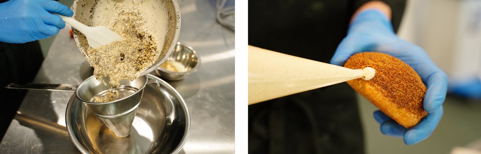 クリームに粉砕した茶葉を直接混ぜ込むことにより、和紅茶の香りを閉じ込めつつ、口溶け感は損なわないような工夫を。