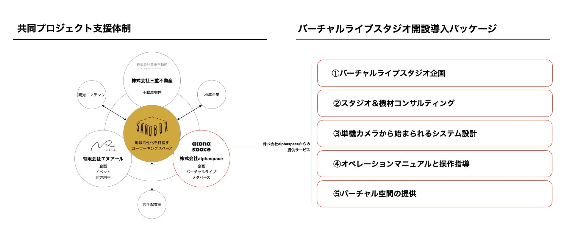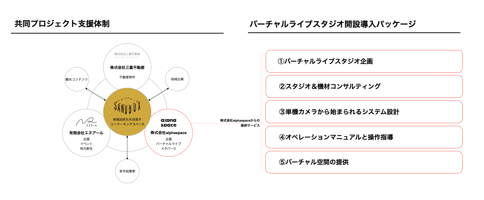 「SAND BOX」のスペースに合わせたグリーンバックスタジオ設営、XR配信に伴う機材選定、配信におけるシステム設計や、XR配信のマニュアル作成を行い地元企業の有限会社エヌアールとの連携によりXR配信におけるサポートを致します。