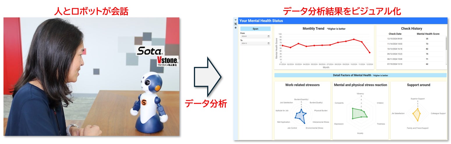 具体的なデモンストレーションとして、ロボットと人が家族や親しい友人と話すような自然で率直な会話を行い、その会話内容を分析してユーザーのメンタルヘルスの状況を数値でビジュアルに示すソフトウェアサービスを展示します。健康経営での活用などを想定しています。また合わせて、ロボット同士が健康に関して会話する様子も展示します。