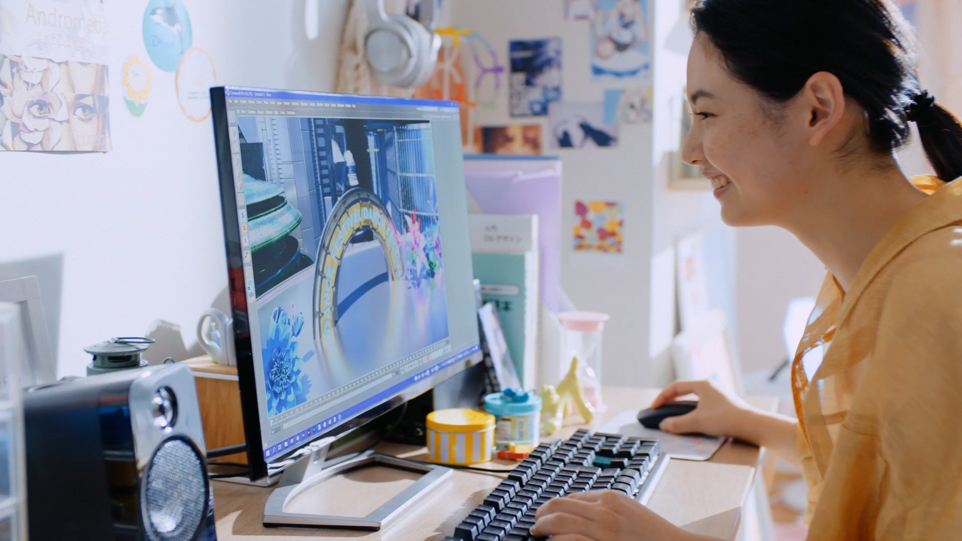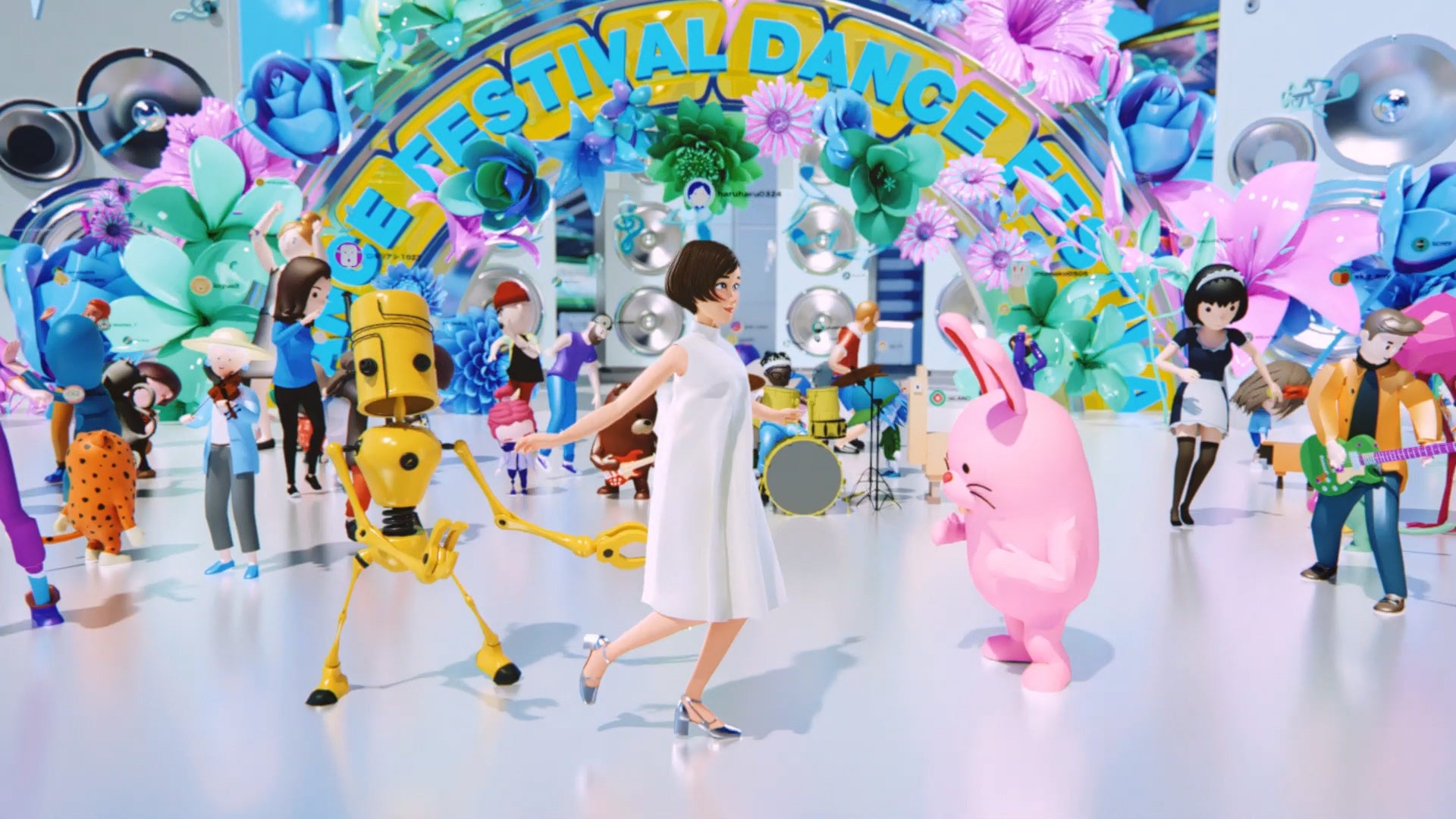 場面は変わって、タブレットに絵を描いている少女が登場。少女が描いたかわいらしいウサギは、少女のアバターとなって綾瀬さんのいるメタバースに姿を現します。さらには、女性がCGで描いたデザインは、メタバースで開催されるダンスフェスティバルの色鮮やかな巨大ステージになり、男性がタブレットで作曲した音楽がメタバースの巨大スピーカーから鳴り響きます。