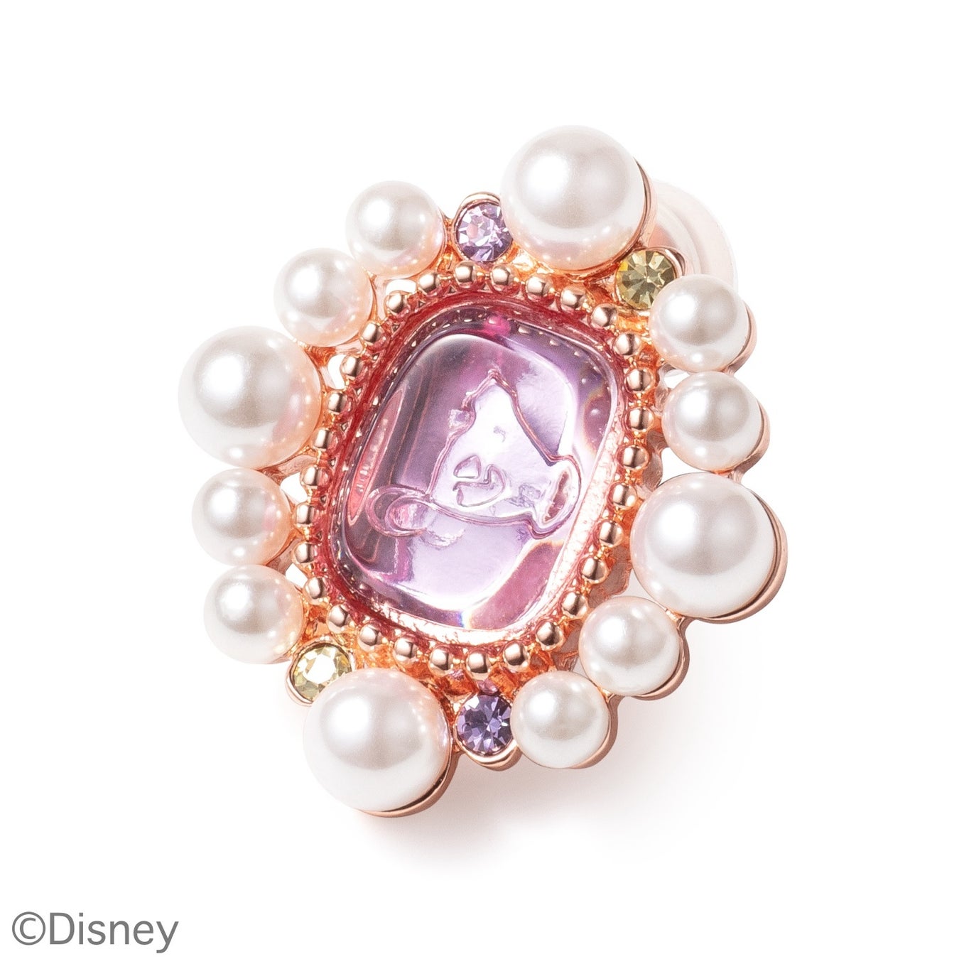 快活で好奇心旺盛なラプンツェル。見ている側も元気 にしてくれる明るい性格は、 自身の幸せをも引き寄せます。みんなから愛されるラプンツェルは、四隅のガラ スをバイカラーにし賑やかな印象に。カラーはバイオレットとジョンキルです。樹脂製の石部分はドレスカラーをイメージしてラベンダーピンク。