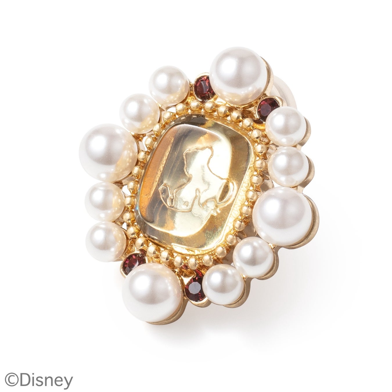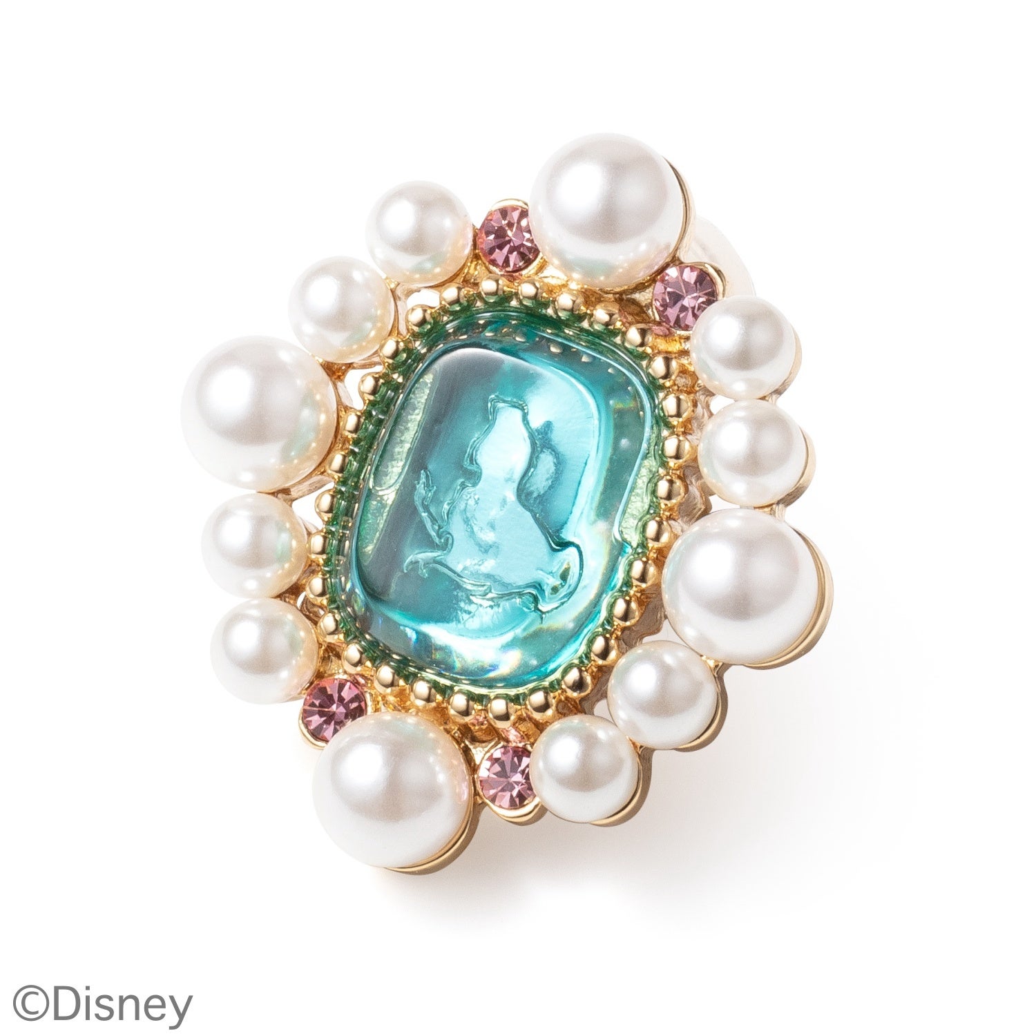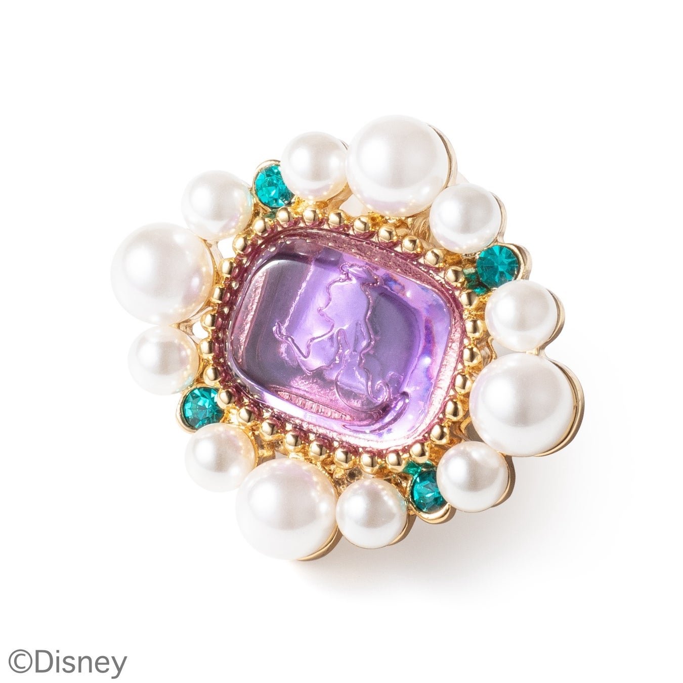 自立心に溢れ、美しく賢いプリンセス、ジャスミン。 アラジンがジャスミンを外の世界に連れ出した名シー ンは「A Whole New World 」の曲と相まって最高の高揚感です。ジャスミンだけは魔法のじゅうたんをイメージして横長のシェイプ。樹脂製の石部分は美しい夜空をイメージ。四隅のガラスは、ドレスのカラーからブルージルコンを使用。メッキカラーはゴールドで、『アラジン』の世界観を表現しています。
