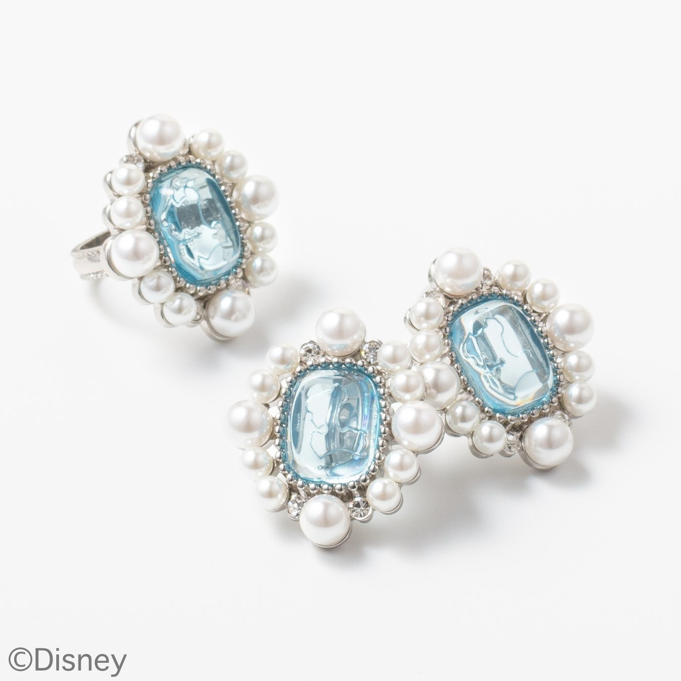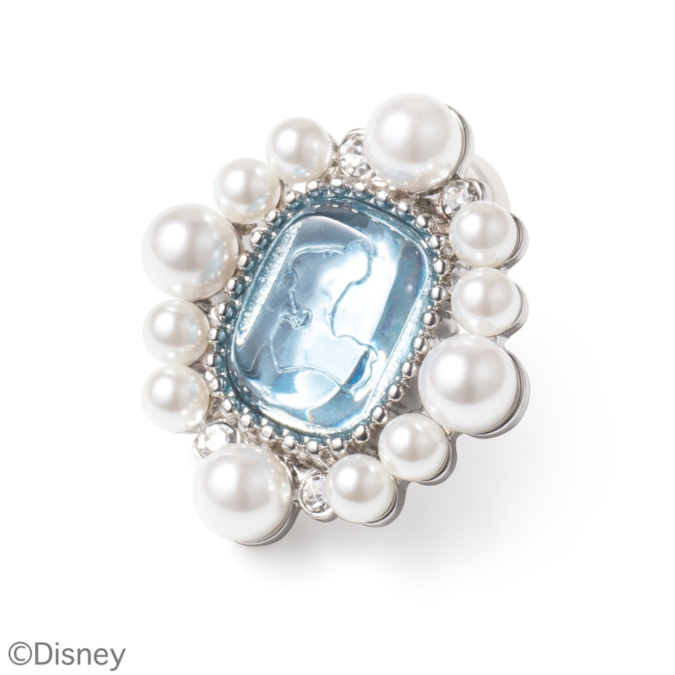 常に前向きで明るい未来を 夢見るシンデレラ。 その変身シーンは子供の頃からの憧れ。樹脂製の石部分 は、象徴とも言えるブルーのドレスのような柔らかい印象のブルーに染め上げました。四隅に、ガラスの靴のようなクリスタルカラーのガラスを配置。その周りに Liquem らしいパールをあしらいました。 メッキカラーはシルバーで、すっきりとノーブルな仕上がりです。