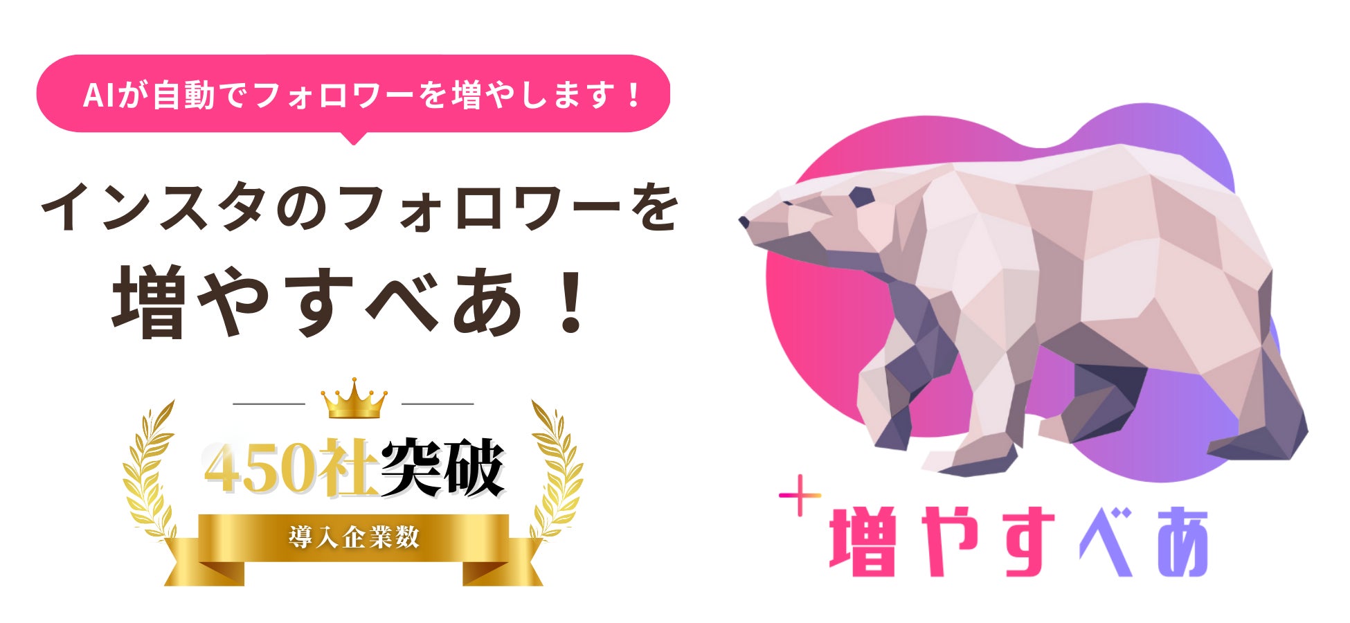 「増やすべあ」は、インスタグラムAI自動運用ツールです。2021年12月にサービス提供を開始、多くのお客様にご愛用いただき1年で450社を突破しました。
