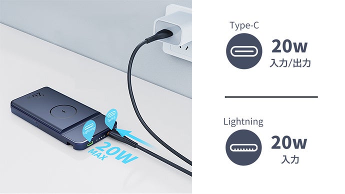 Lightning&Type-Cポート付き、有線充電の場合にも対応。Type-Cは入力も出力も20W急速充電できます。スマホ2台+Apple Watch1台の同時充電をサポートし、友達とのシェアや、Androidスマホへの充電もバッチリ!