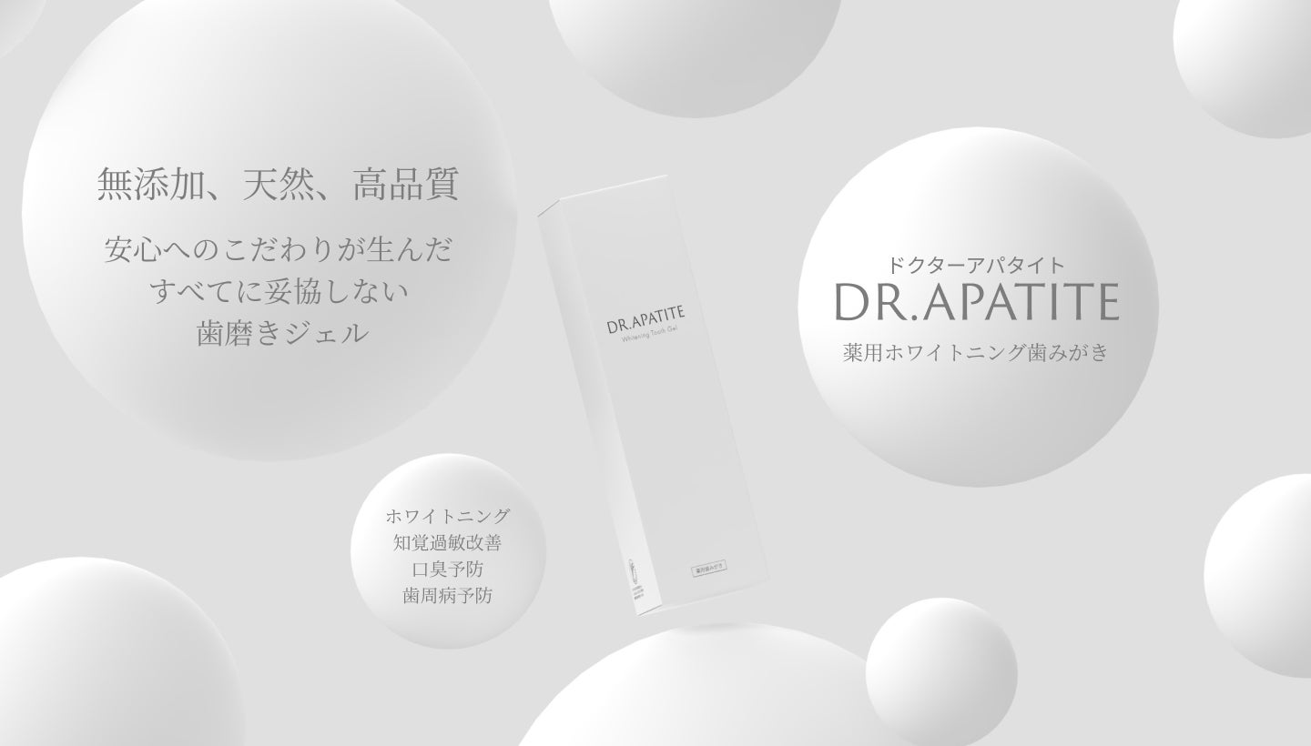 Dr.アパタイト株式会社では、ハイドロキシアパタイトによる歯の再生効果(再石灰化)に着目し、歯の汚れ(ステイン)を落とすだけでなく、同時に歯の表面を再生させるWホワイトニング処方の 『DR.APATITE 薬用歯磨きジェル』 を開発しました。