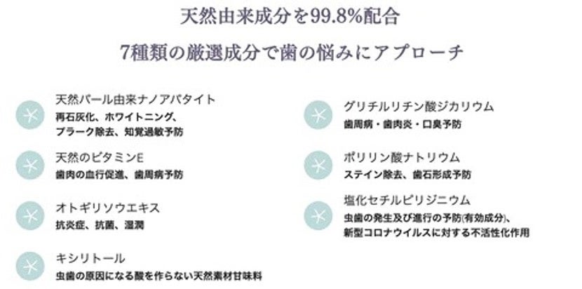 天然由来成分を99.8%配合し、 7種類の厳選素材(パール由来ナノアパタイト、グリチルリチン酸ジカリウム、ビタミンE、ポリリン酸ナトリウム、オトギリソウエキス、塩化セチルピリジニウム、キシリトール)で歯の悩みに徹底的にアプローチします。