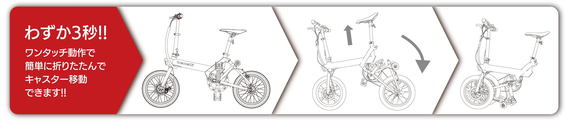 避けては通れないカーボンニュートラルへの取り組み、withコロナの3密を避ける移動手段、最近のキャンプブームの中心にあるソトナカ消費志向、これらのニーズに最適解を提供する「折りたたみ電動アシスト自転車のNEWスタンダード」それがこの「benelli miniFold16シリーズ」なのです。