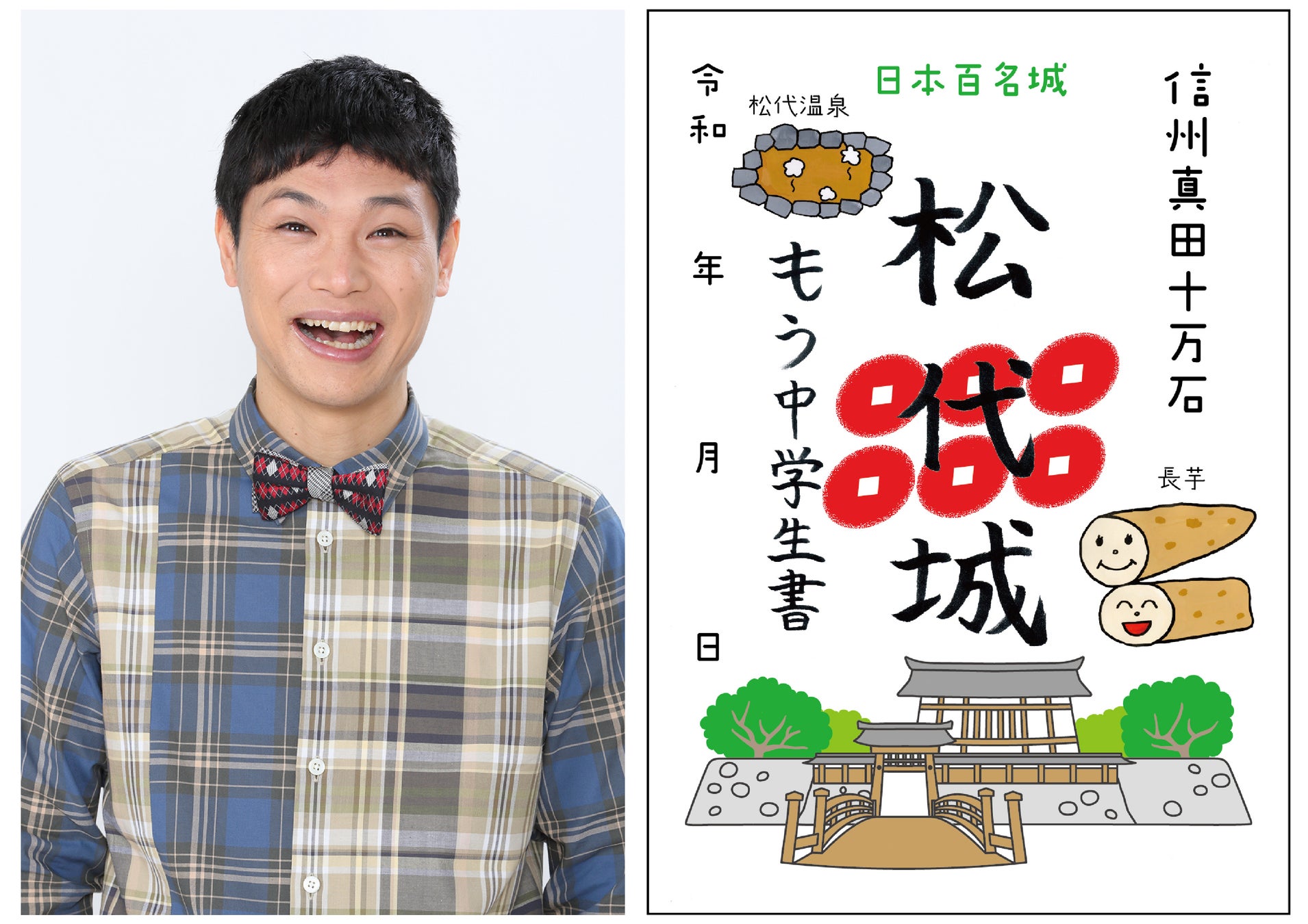 今年の10月12日(土)と13日(日)に開催される「真田十万石まつり」の大名行列に参加していただく長野市出身のお笑いタレント「もう中学生」さんに、松代城の題字やイラストを描いていただいた、記念の御城印を、この度販売することになりました。